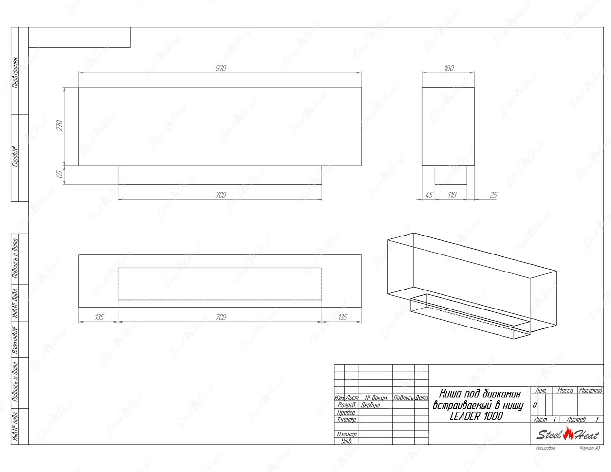 Встраиваемый Биокамин SteelHeat LEADER-SH 1000 предназначен для встраивания в глухие ниши из гипсокартона, кирпича, пеноблоков, бетона.