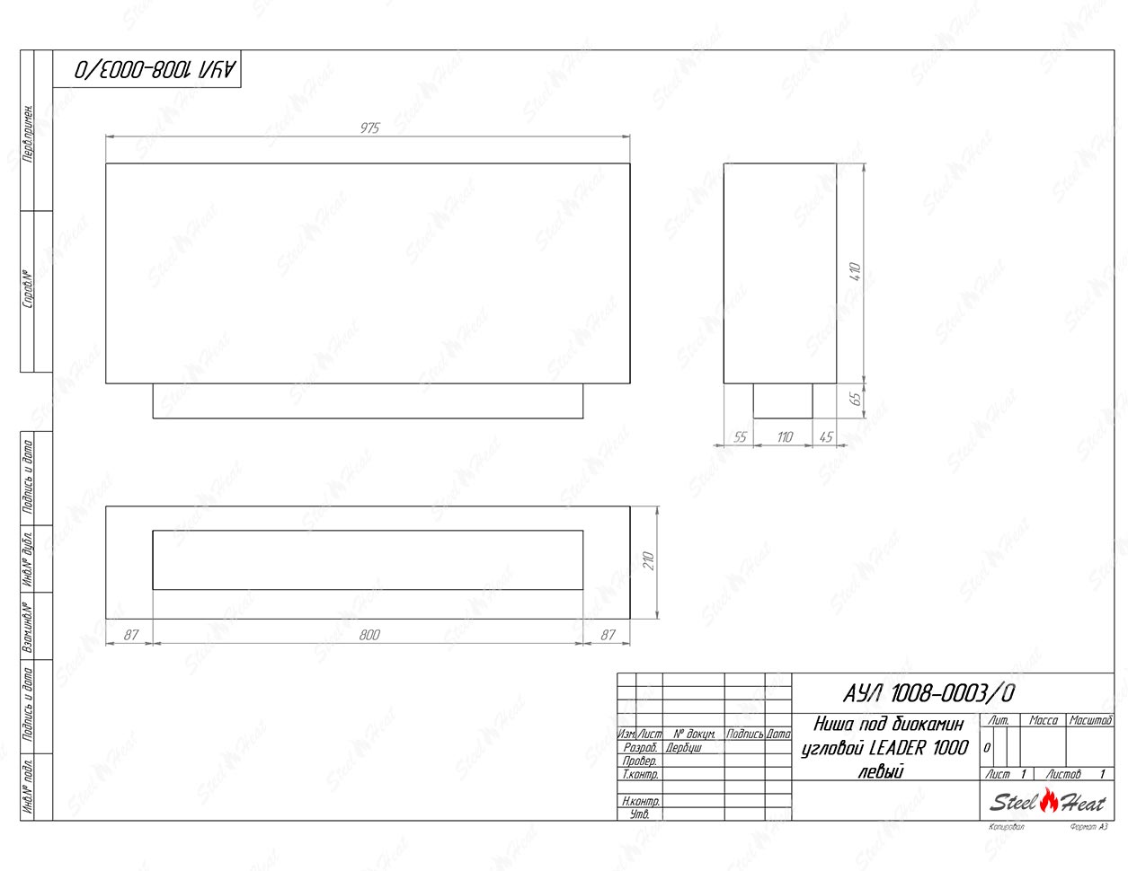 Встраиваемый Биокамин угловой SteelHeat Leader 1000 левый предназначен для встраивания в глухие ниши из гипсокартона, кирпича, пеноблоков, бетона.