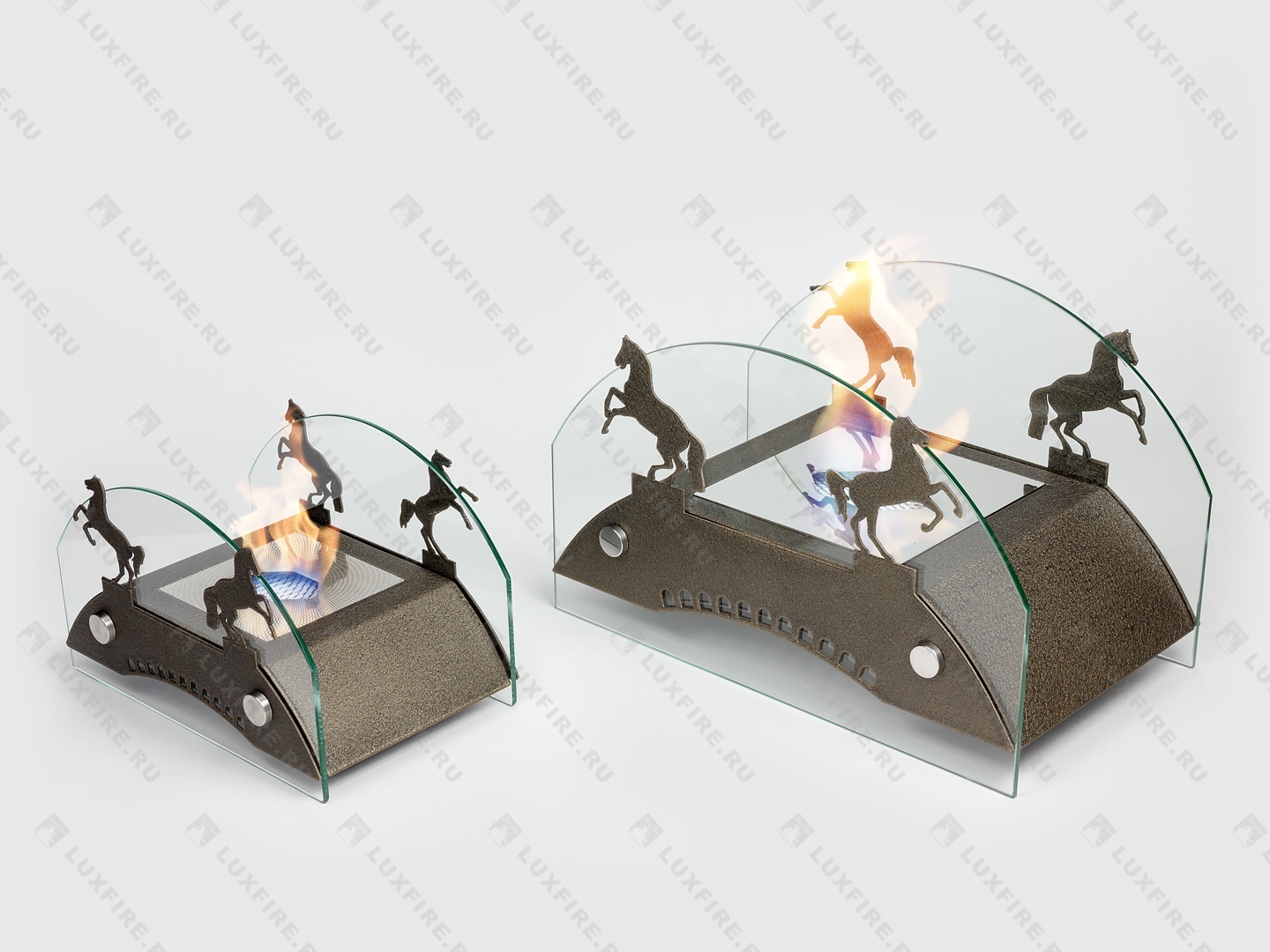 Представляет собой биокамин, который создан по мотивам мостов дореволюционной России середины ХIX-начала XX века и состоит из металлического корпуса с топливным блоком Lux Fire 150-1 огражденным с двух сторон скругленными защитными стеклами на дистанционных держателях и декоративными металлическими накладками в виде «Коней»